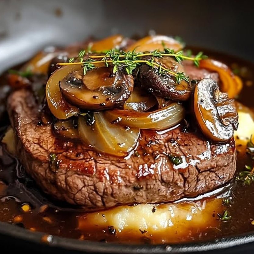 Enjoy your Filet Mignon with Mushrooms and Onion Sauce! The tender filet mignon pairs beautifully with the savory, creamy mushroom and onion sauce, creating a deliciously satisfying meal perfect for special occasions or a weeknight treat.